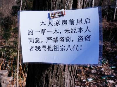 近日,笔者在十堰市郧阳区白桑关镇一村庄里看到一户村民过完年离家时在门前树上挂着一个塑封告示牌,上书"夲人家房前屋后的一草一木,未经夲人同意,严禁盗窃,盗窃者我骂他祖宗八代"。由于户囗制度改革后,大量人囗拥入城市,农村只剩下"三八六一"部队,即留守农村的老人,妇女和儿童,而且只有少量人囗住守乡村。锁门的房屋有人被小偷进入,有的成了进山拉线放电盗猎的住所。许多没人住的房屋门前长起了一人多高的野草的野树,许多没人住的房屋已经倒塌。许多村民离家时在门前挂上了告示牌。