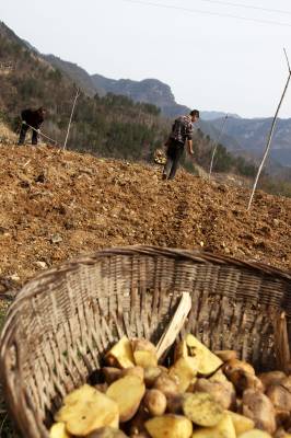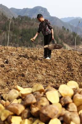 2月18日,竹溪县丰溪镇周家坝村贺德银(左)与孙子一起播种土豆。立春过后,气温升高,竹溪县农民纷纷抢抓时节开展春播备耕,田间地头一派繁忙。