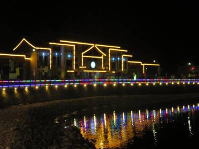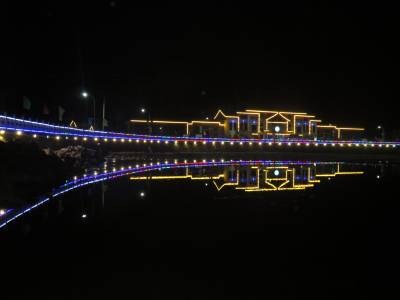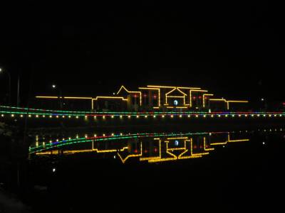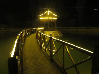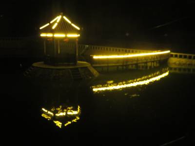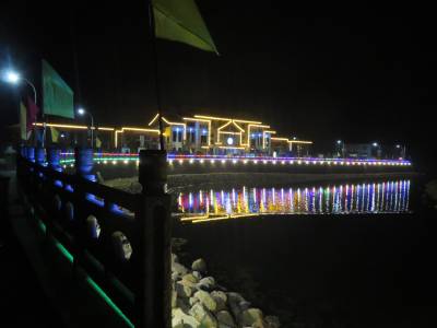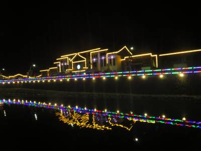 据悉,为了办好“土家赶毛狗 石柱闹元宵”活动,湖北秭归县圣天观集团旅游服务有限公司对圣天庄园进行了大手笔的亮化和美华。夜幕初降,橘黄色的灯火点燃,给圣天庄园的主建筑镶上了金黄色的花边,在沿河边的走廊上,七色光交替辉映,点点灯火倒映在水里,宛若流萤点点,微风吹送,荡起层层波纹,几条七色游龙在花桥河水里摇曳、翻腾,煞是好看。炫丽的光带将闲垂钓的凉亭环绕,倒映水中,水波荡漾,一群群鱼儿争相啄食,嬉戏追逐打闹,格外有趣,引人入胜。 湖北日报荆楚网通讯员 韩裕平 邹厚虎 摄
