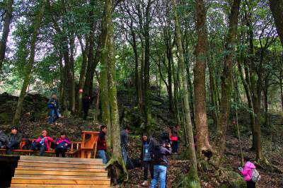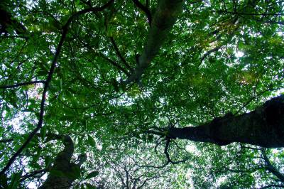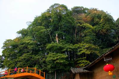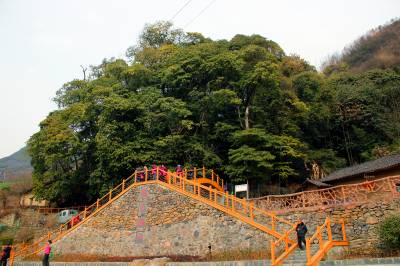 2月23日,我们慕名来到位于十堰竹溪县新洲乡烂泥湾村的楠木寨。在高于河面80余米的山腰处,但见百余株楠木簇拥成林,遮天蔽日,满日葱茏。据介绍,这块楠木群是我国目前现存最大的金丝楠木群落,现保存有楠木144株,占地8亩,历经几百年风雨沧桑而完好无损。其中最粗壮的一株楠木需三人合抱,高30多米,省林业专家判定树龄至少在600年以上,是这片楠木林最具代表的树。