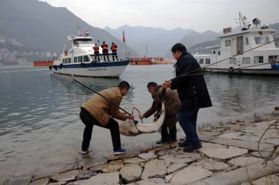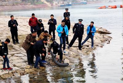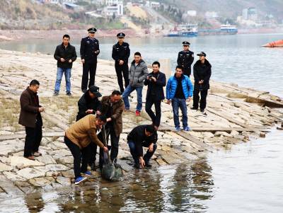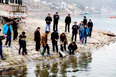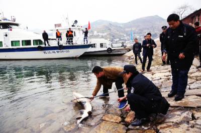 放流中华鲟 24日,在三峡库岸巴东县官渡口镇段长江大桥下,工作人员正在放流中华鲟。当天下午,15条中华鲟运送到巴东长江大桥北岸江边,最大约40公斤,小的也有10公斤。县水利水产部门工作人员将其放流江中。据了解,中华鲟是中国特有的珍稀保护动物,巴东放养这么大的中华鲟尚属首次,目的是让中华鲟在长江水域中自然繁殖。(视界网穆世祝摄)巴东县官渡口镇中心学校(444309)