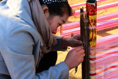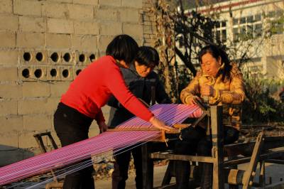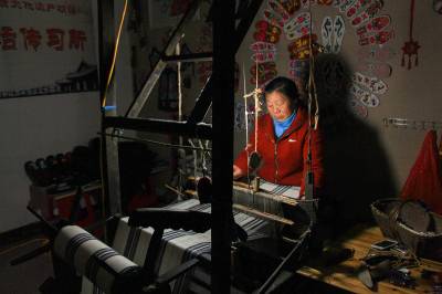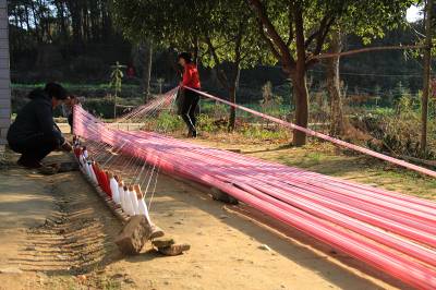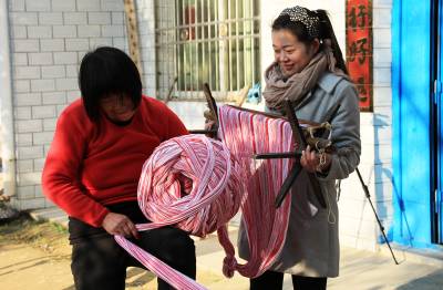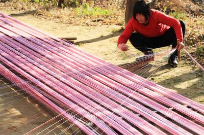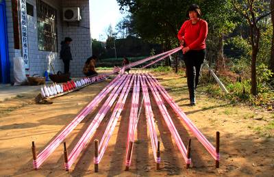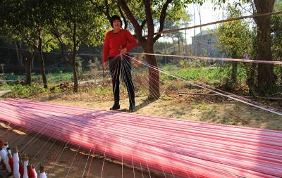 “最后一碗饭做军粮,最后一尺布缝军装。”这是在湖北省黄冈市红安县广为流传的一首民谣。这首歌谣生动地描述了在革命战争年代,红安人民倾其所有支援红军,用大布为红军将士制作军服、被单的真实情景,歌颂了红安人民“男将在前方打仗,女将在后方织布送衣”的无私奉献精神。如今,歌谣里的红安大布,2009年被列为湖北省第二批非物质文化遗产名录,2010年亮相上海世博会“中国元素活动区”,2012年获得中国合作经济年度成就奖——“中国具有影响力合作社产品品牌”荣誉称号,已成为著名的地理标志保护产品和红色旅游品牌产品。据了解,红安大布又称“家机布”、“景庄布”,是红安县民间手工制作的一种纯棉纺织珍品,具有浓郁的乡土气息和鲜明的地方特色。其传统纺织技艺含量高,具有丰富的文化内涵。据《红安县志》记载,1908年,日本水野幸吉所著《汉口》一书中记载:“黄安(今红安)的景庄布(即大布)细密、光洁、温暖,亦复耐久,故无论男女,均用以制衣裳”。制作红安大布共有大大小小72道生产工序。其中,主要工序概括为15道:轧花、弹花、纺线、浆线、屯线、落线、经线、刷线、做综、闯杼、掏综、吊机子、织布、了机等。视界网 曾建新摄