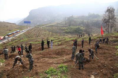 2月25日,竹山县200余名县直机关干部驱车到文峰乡滚子岭植树点栽植优质“辽”核。连日来,该县抢抓春季造林的有利时机,各乡镇按照“造林计划提前分解,造林地块提前准备,林木种苗提早储备,造林苗木保障充足,组织生产准备有序”的要求,超前做好地块落实、种苗采购、资金筹措、造林组织等工作,迅速掀起挖窝整地、科学栽植特色苗木的热潮。据了解,竹山县今年将完成造林67100亩。其中绿满竹山35000亩,新一轮退耕还林32100亩,完成17个绿化示范村创建达标,管理老基地10万亩。(视界网程平 摄影)