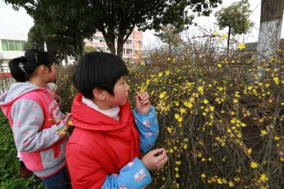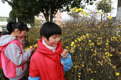迎春花开香满园 (图文) 竹山县宝丰镇中心学校 朱本双 电话:13177481456 邮编:442213 电子信箱:zsbfzbs@126.com 身份证号码:422624196910182052 2月25日,竹山县宝丰镇红卫小学的学生正在校园里观赏盛开的迎春花。近年来,该镇制度化、规范化、常态化加快生态校园建设,因校制宜种植花草树木和绿地,达到降温、滞尘、杀菌、减噪的作用,进一步优化学校育人环境,增强师生环保意识,实现绿色校园生态美。