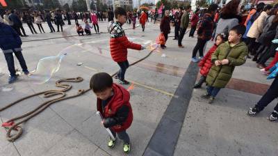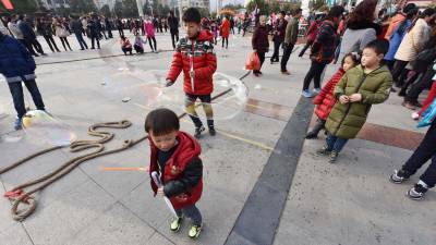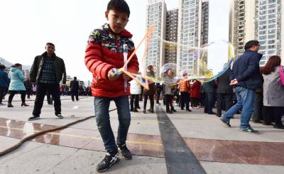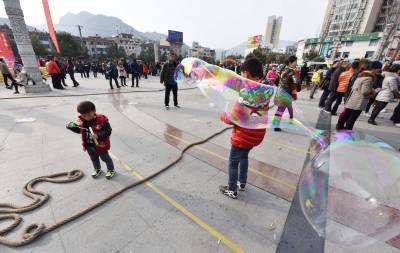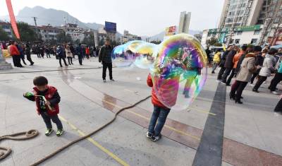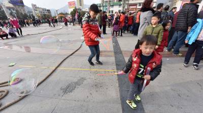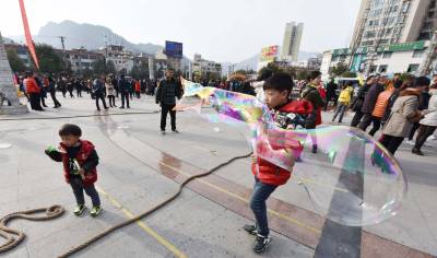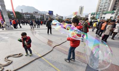 周末,保康县紫薇广场,两名小男孩在玩吹泡泡。(欧阳智慧 摄)