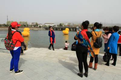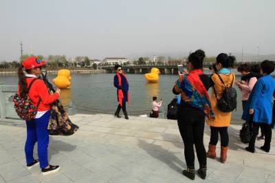 2月28日,游客在房县城区三道河与正在嬉水的大黄鸭拍照合影。该县依托环抱城区的生态河流,修建人工湖,打造水利生态游玩景观,引进大黄鸭吸引游客观光。目前,完成投资6亿多元,治理城区河流44公里,兴建湿地人工湖17座,为蓄水赏景、调节河流径流、提高水体纳污能力,发挥着天然的“调节器”和“净化器”作用,水质达到国家1级标准,一举成为鄂西北地区县级最大的水利生态旅游圣地。