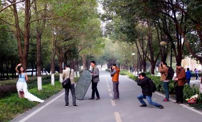 随着城乡居民生活水平的不断提高,喜欢摄影的人越来越多,他们经常通过组织摄影活动度过自己的休闲时光。2016年2月28日是一个星期天,在风景优美的生态园林式学校——湖北工程学院的校园里,一群摄影爱好者手握长枪短炮,摆开架势,正在对着一位模特聚焦、拍摄。(祝大桥 摄)