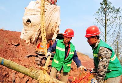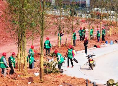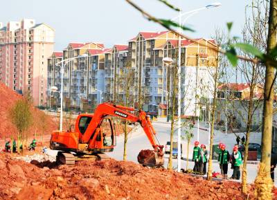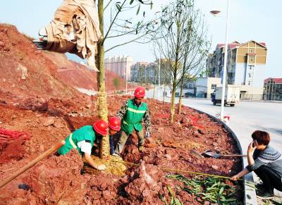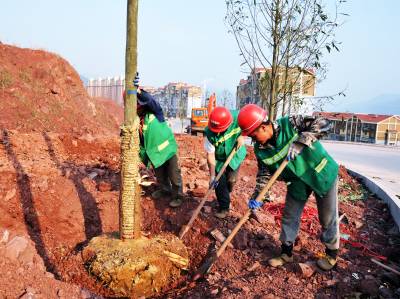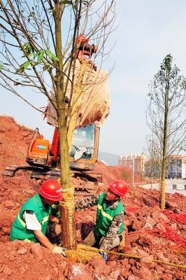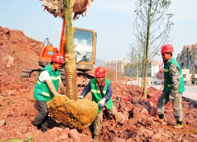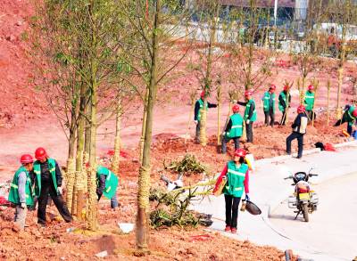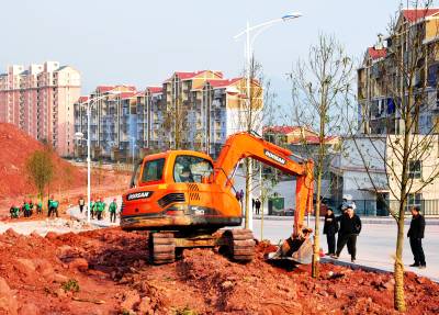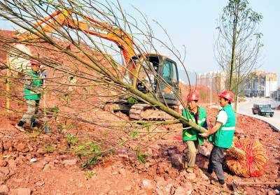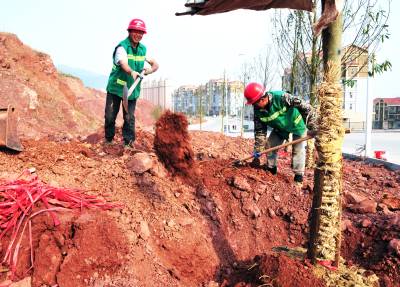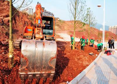 铜鼓包上披绿装 3月1日,铜鼓包上,挖机和数名工人在栽种木莲树。 以前,铜鼓包因恶劣的自然环境和土壤结构,寸草不生,很早就有“窝屎不长蛆”之说。2008年,巴东县引资10亿多元,在此新建神农小区。为了打造绿色、生态、环保、花园式新居,自去年来,该县又筹资千万元,从外地购树苗、移土培肥,在小区内培植香樟、桂花、紫薇、巴东木莲、杜鹃等30余种乔木、灌木和地被植物百万株,绿化面积2万平方米,宜居、宜业、宜游。(视界网 梁勇 摄)13986846069