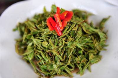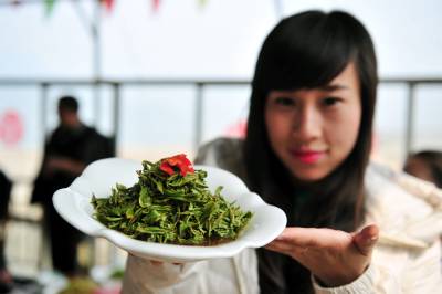 阳春三月,宜昌新茶上市,正是饮茶好时节。我国茶文化博大精深,常为人们所知的是明前茶和雨前茶。除了饮茶之外,让茶叶作为一种食材加入菜中,不仅溢满茗香,也具有一定保健功效。视界网 张国荣 摄
