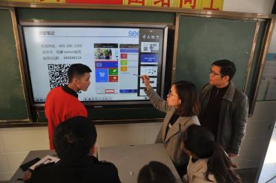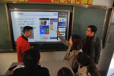 3月4日,鹤峰县五里乡苏区小学教室,老师们就希沃交互式智能平板的使用,与培训技术人员进行了交流和探讨。
