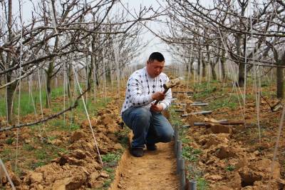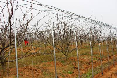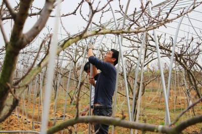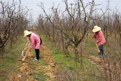 2016年3月7日,云梦县曾店镇桃花山生态采摘园工作人员在果园为冬枣施肥、为樱桃树搭建大棚架,加强春季果树田管,为全年果树增产、增收打基础。