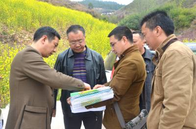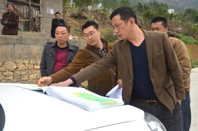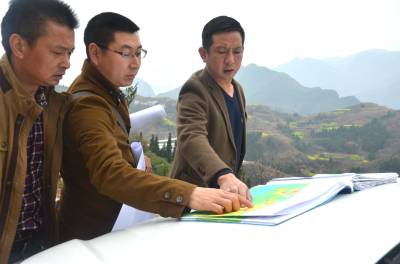 3月7日,巴东县官渡口镇技术员正在后山、茅坝村对照图纸现场确认光伏区域。 据了解,该镇抢抓光伏扶贫机遇,在火峰,后山、茅坝村连片选址确认3000余亩光伏区域,预计总装机容量达到6万千瓦。(巴东县官渡口镇政府向传辉摄 电话 18963928551)