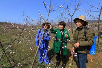 3月11日,竹山县宝丰镇农技中心农业技术员向青云(中)深入该镇深沟村联民雪桃农民专业合作社,现场“手把手”指导果农科学管理雪桃。日前,该县把精准扶贫和服务春耕生产紧密结合,及时组织农林科技人员和党员干部进村入户当好农民的“田保姆”,到田间地头现场授课,面对面培训,手把手传授,为农民提供 “保姆式”服务。