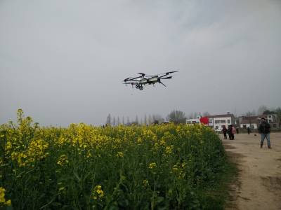 本报讯(通讯员程国辉)为进一步降低油菜病虫害防治成本,应城市积极开展油菜菌核病“飞防”技术示范推广,3月14日上午,在应城市城北办事处魏河村万亩优质油菜示范片,2架6旋翼植保无人机装好配制的药水后,在专业人员的遥控指挥下,来回轻盈自如地穿行在金灿灿的油菜田上空,为确保21.8万亩油菜实现全程机械化生产,该市预计将有近3成油菜田实现菌核病“飞防”。