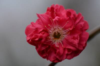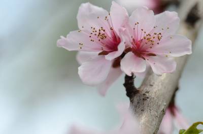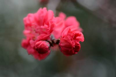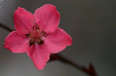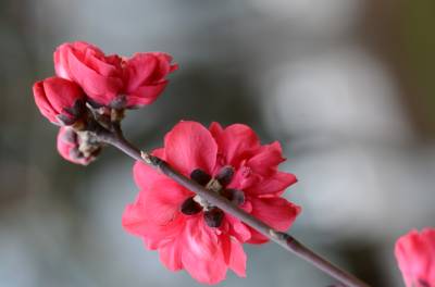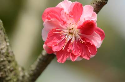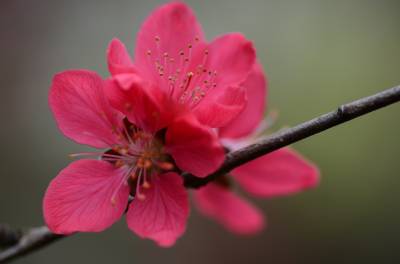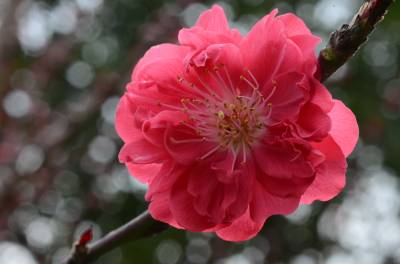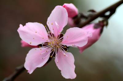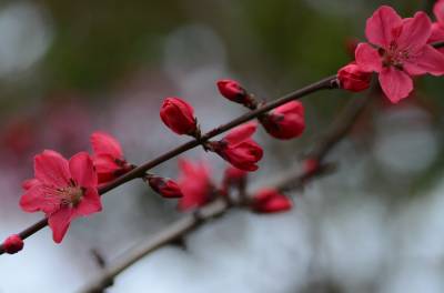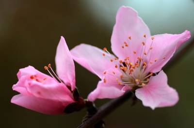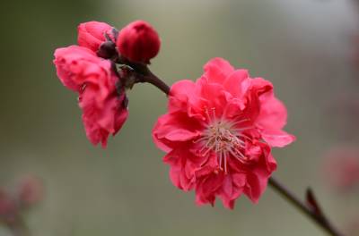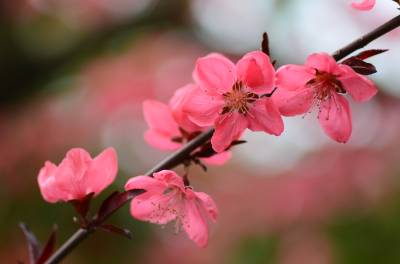 桃花,属蔷薇科,落叶小乔木,高可达6至8米。树干灰褐色,粗糙有孔,花单生,有白、粉红、红等色,重瓣或半重瓣,花期3月。桃花为中国传统的园林花木,树态优美,枝干扶疏,花朵丰腴,色彩艳丽,为早春重要观花树种。桃花原产于中国中部及北部,栽培历史悠久,各地广为种植。性喜阳光、耐寒、耐旱、不耐水湿。桃花果实为桃;桃核可以榨油;其枝、叶、果、根俱能入药;桃木细密坚硬,可供雕刻用。