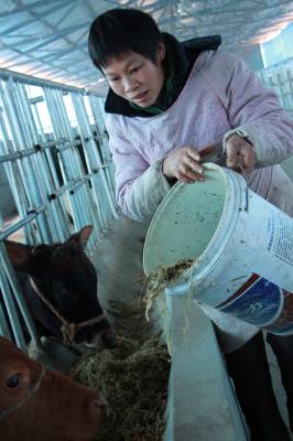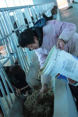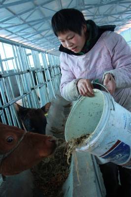 3月15日,十堰市竹溪县鄂坪乡小汇村贫困户曹和菊正在村养牛场里给牛添加饲料。 据悉,该养殖场由十堰市审计局在精准扶贫工作中援建。全村村民通过资金、实物或者劳力都可入股,参与收益分红。有3户贫困户长期在此务工,一年纯收入在15000元。(柏元军)