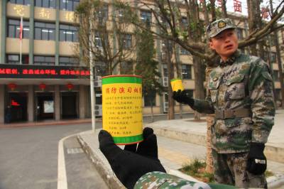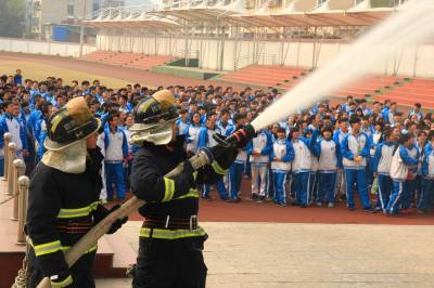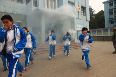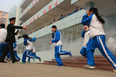 演练通过在教学楼投放烟雾弹,模拟火灾现场,随后消防警报,同时学生用毛巾捂住鼻子开始朝运动场疏散,并清点入数,上报消防大队大队长。大队长提醒师生,因为烟雾密度比空气轻,火场疏散时,切记在捂住鼻子的同时,要弯腰撤离。最后,消防官兵全副武装向师生演示现场实战灭火演练。