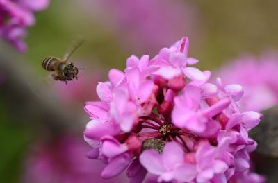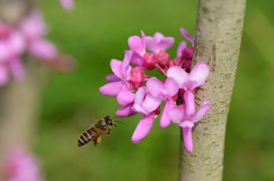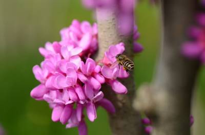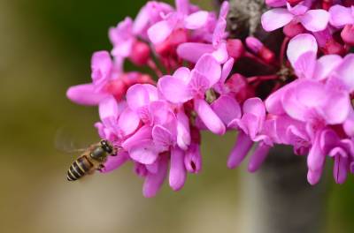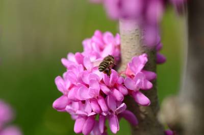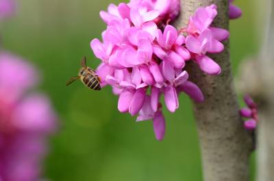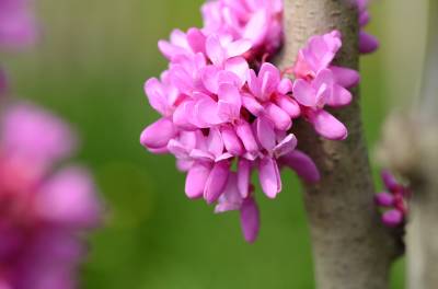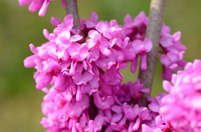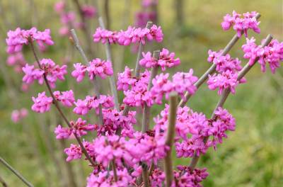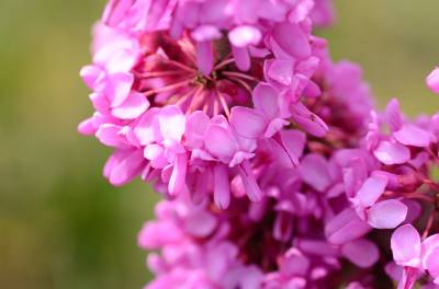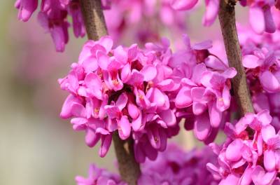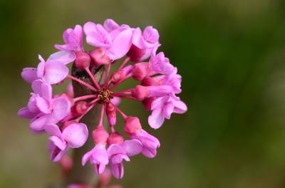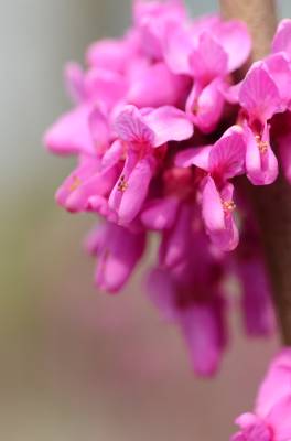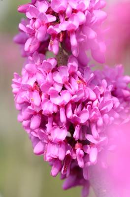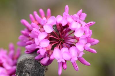 花紫红色或粉红色,2-10余朵成束,簇生于老枝和主干上,尤以主干上花束较多,越到上部幼嫩枝条则花越少,通常先于叶开放,但嫩枝或幼株上的花则与叶同时开放,花长1-1.3厘米;花梗长3-9毫米;龙骨瓣基部具深紫色斑纹;子房嫩绿色,花蕾时光亮无毛,后期则密被短柔毛,有胚珠6-7颗。