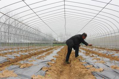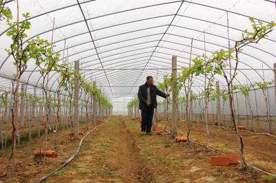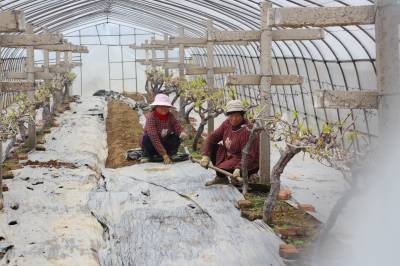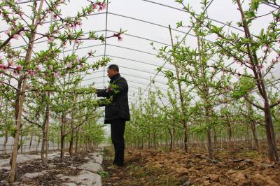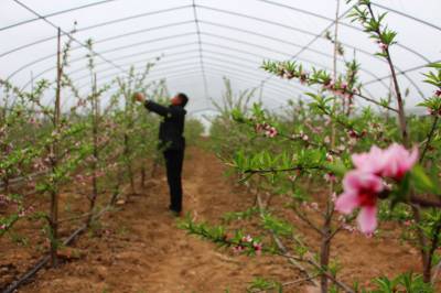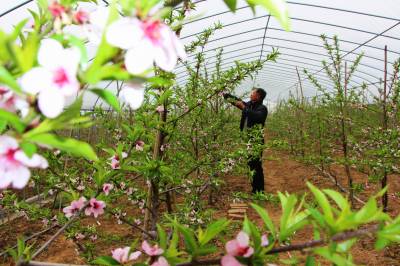 2016年3月15日,工作人员在云梦县伍洛镇中丁村倪国高生态采摘园忙着大棚桃树、葡萄树等果树的管理。去冬今春,伍洛镇中丁村生态采摘园新增22个果树大棚,扩大面积24亩。目前该采摘园达到64个大棚,53亩,共有葡萄、冬枣、李子、樱桃、白玉枇杷、脐橙、猕猴桃等优质品种40多个,成为全县家庭农场和生态采摘园带头户。