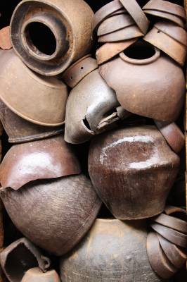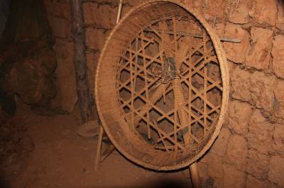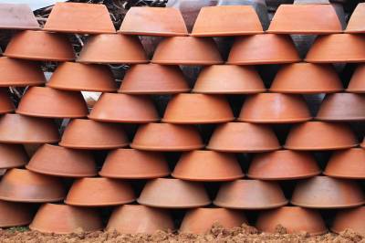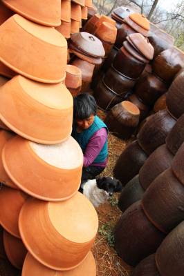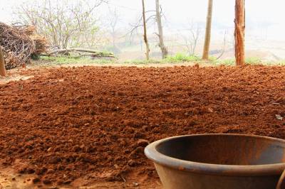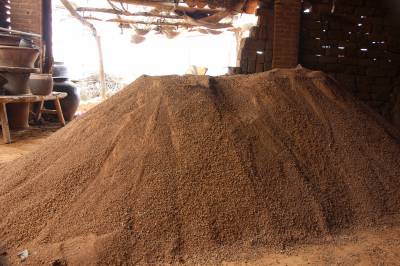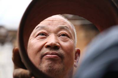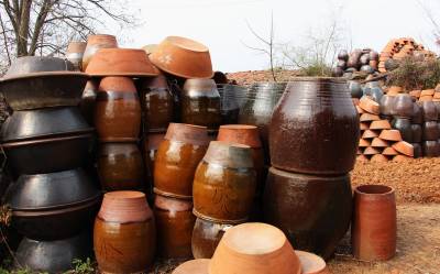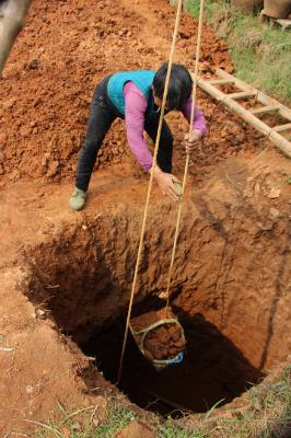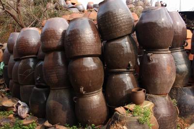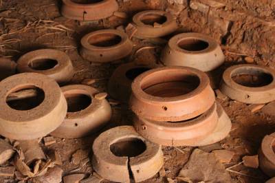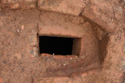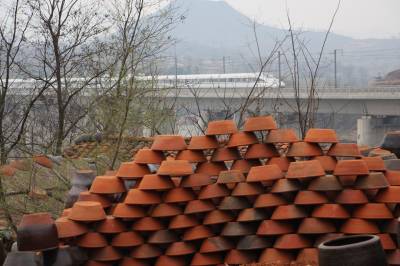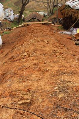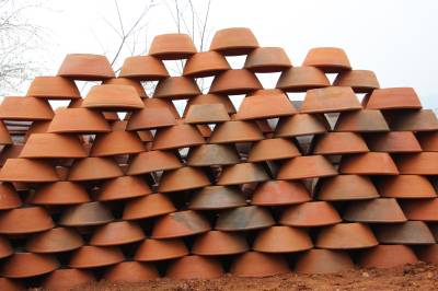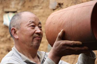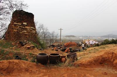 江冲村位于湖北大悟县新城镇新城西北部,是共和国一代名将徐海东大将的故乡。时光流逝,斗转星移,红色土地上将军故居仍在,将军昔日烧过的有着千年历史的土窑仍在。据当地76岁的村民吴泽信老人介绍,他所在的江冲村有两座龙窑,一座是江冲村的黄家龙窑;一座是江冲村九组吴家坳的麻林龙窑。黄家龙窑历史更早,已经关闭停烧,那里土陶碎片到处都是,有的堆成小山。目前只有麻林龙窑在继续使用烧制土陶。当日,1955年出生的吴泽山和同年出生的妻子邓宝华在麻林龙窑一则的深坑中忙碌着起土,储备烧制土陶的原料。吴泽山在深坑中挖土、装土,装满箢箕后勾上钩子,拉动滑索,妻子在洞口协同提土。他们夫妇俩配合默契,一箢箕,一箢箕,将红土原料提上来,堆积一旁。在龙窑的上方,另有几个村民在用拖拉机运送松柴到龙窑附近上堆,储备龙窑开火烧制土陶的松柴燃料。