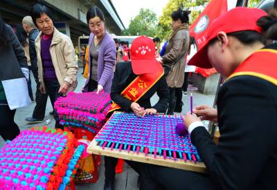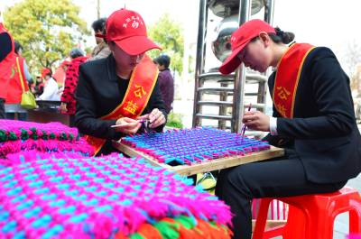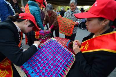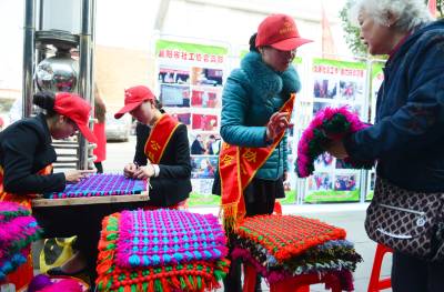 3月18日,襄阳市社会工作者协会志愿者巧手编织脚垫现场义卖。当日,襄阳市民政局和团市委举办第10个“国际社工日”宣传周启动仪式,该节日旨在倡导为社区内弱势人群解决问题,为有需要的人士贡献自己的爱心、知识和技巧。 视界网 谢勇 摄