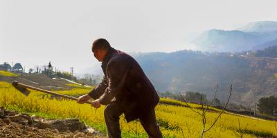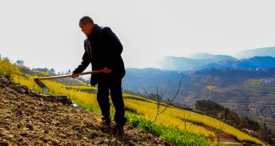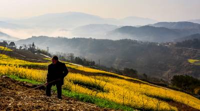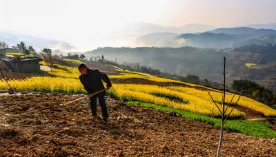 3月19日,竹溪金灿灿的油菜花儿遍地黄,洁白的云海时浓时淡掩映山脉、隐约村庄,勤劳的人们不违农时日出而作,备耕下种,忙碌在洁白的云海,金黄色的油菜构成美丽的自然画卷之中,在劳动中享受自然美景,在自然美景中快乐的耕耘。2016年3月19日,竹溪县县河镇柏树村留守老人童明春在精耕细作计划种玉米的自留地(视界网温大树摄)。