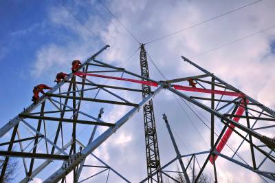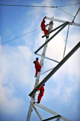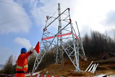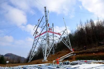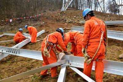 3月18日,在湖北省恩施州境内,北京送变电公司员工在加紧组立酒湖±800千伏特高压输电铁塔。 酒泉--湖南±800千伏特高压直流输电工程是西部风电、太阳能新能源外送重点建设项目,湖北段全长206公里,铁塔总计451基。目前,湖北段基础开挖427基,占总量的94.68%;基础浇筑406基,占总量的90.02%,满足转序要求,工程建设者们抢抓晴好天气,全力加紧铁塔组立。(视界网王祖满摄 15272999779)