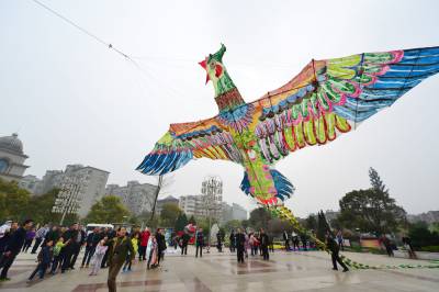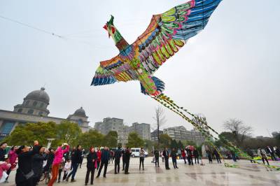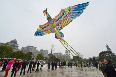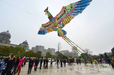 3月20日,襄阳的风筝爱好者在南湖广场放飞一盏凤凰造型的巨型风筝,当日正是农历春分节气,襄阳市举办“放飞襄阳梦”公益风筝节,并举行了风筝义卖活动,吸引大批市民参与。 视界网 谢勇 摄