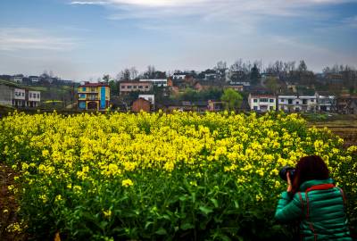 3月18日,在竹山县宝丰镇垭子街村看到,一眼望不到边的数百亩金灿灿的油菜花海中,一幢幢粉墙黛瓦的庸派建筑民居掩映其中,宛若一幅幅温馨的水墨画。蜂飞蝶舞,草泛青,树萌绿,双休从县城自驾而来的游客在如诗如画的田间地头与花儿景儿合影留念的随处可见。 进入3月下旬,该县十万亩油菜花逐渐进入花盛期,该县城关、潘口、麻家渡、宝丰、擂鼓等中西部乡镇因油菜种植成片,地势平缓,视野开阔,加上交通便利,成为县内乡村游火爆的主要原因 。(石濡华 摄)竹山县国土资源局