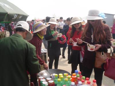 3月18日,游客在孝南区杨店镇桃花节活动现场品尝该镇铁坝村豆丝加工户邬礼柏夫妇现场烫的豆丝。 该镇铁坝村豆丝加工户邬礼柏夫妇今年将豆丝加工作坊搬到当地桃花文化旅游节上,用自家泡制的酸菜炒出的新鲜豆丝,酸爽可口,受到游客青睐,当日烫出豆丝1000多个,每个2元,除去成本,净赚1500多元。