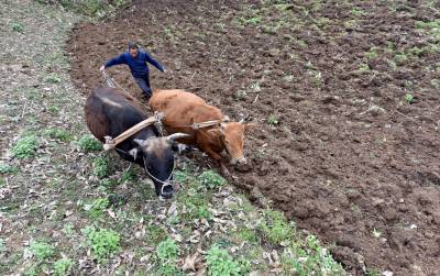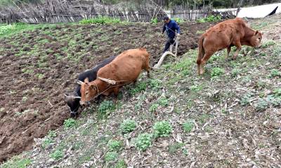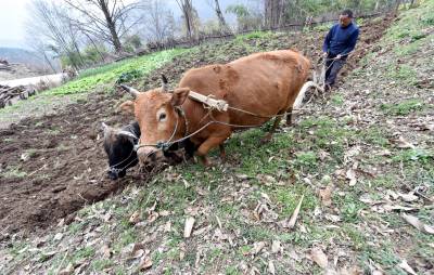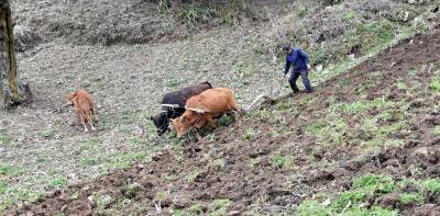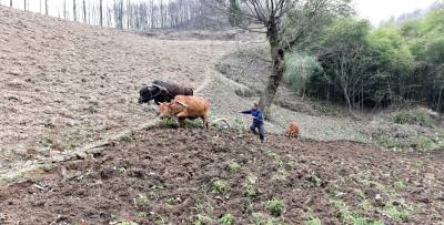 3月29日,在海拔1100余米的保康县后坪镇汪家沟村,一位农民正在自家的田地里忙耕作。(视界网 欧阳智慧 摄)