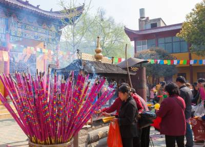 油菜花海成片,红叶石楠成排,通往宗教圣地的小路春意盎然。一波又一波人群扶老携幼、呼朋引伴,满面春风赶庙会。