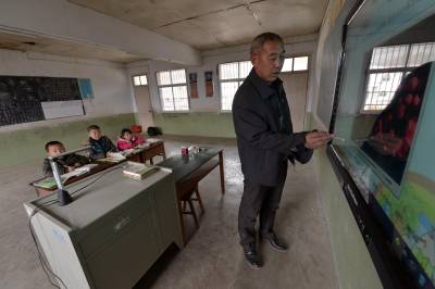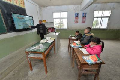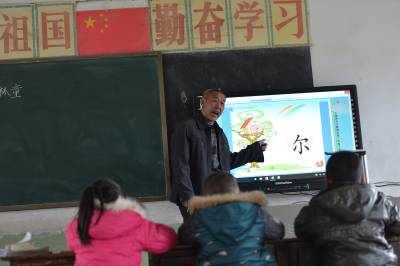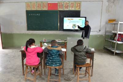 李吉川给3名学生周一到周五每天要上6节课,主要负责3名学生的语文、数学、品德、体育课程。由于教学条件有限,美术、音乐等课程通常由李吉川通过多媒体教学设备来完成。(视界网 杨韬 摄)