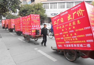 竹溪兴起环保拉风广告 3月31日,竹溪人民路上一支由板车组成的广告宣传队,深受市民关注。据悉,这种板车宣传队,以宣传范围大小计酬,不仅能带动劳动力就业,而且相对于其它方式的广告投放,成本低,绿色节能环保。近年来,这个拉风式的广告宣传深受竹溪的企业、商铺欢迎。(郭军 摄)