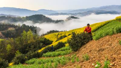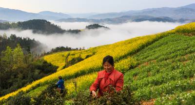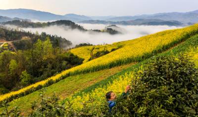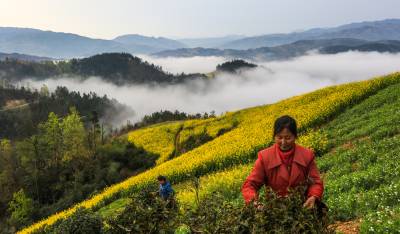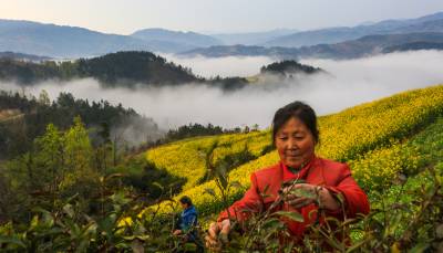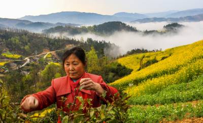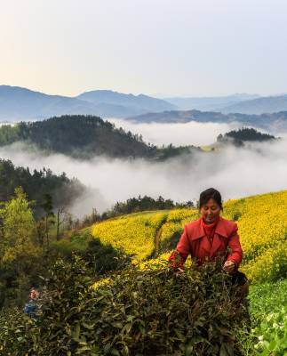 2016年3月31日,竹溪县县河镇惠家沟村茶农柯美英等在本村油菜花海傍采摘茶商抢购的清明前活叶“箭茶”。