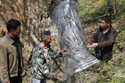 3月30日,吴官仁向林业局电话求助,说他自家屋山头有一棵50多岁的核桃树,2013年秋季还收了2斗核桃果(一斗相当于28斤核桃),可最近两年只见果不见收,见产不见效,需求林业专家上门技术指导。次日,肖艳华与潘口乡林业站工作人员一起带着防病虫害的药物和薄膜到老吴家现场作技术指导,同时还对周边核桃种植农户指导了核桃树的拉枝、病虫害防治打药和施肥等技术操作。(视界网程平 摄影)