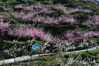 近日,宜昌市夷陵区樟村坪镇桃花寨千亩桃花在山谷间绽放,大片的桃花色若凝霞,处处春意融融,吸引众多游客赏花踏青。(视界网 杨韬 摄)