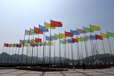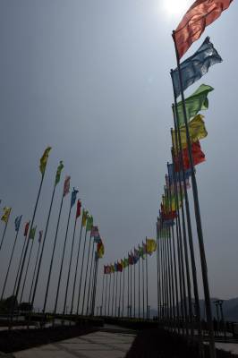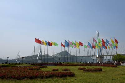 绿地草坪从南京引进无土栽培高羊茅铺成。栽种桂花、雪松、广玉兰、柚树、水杉等大树315棵,红榉木、金叶女贞、杜鹃等灌木12500株。10万盆鲜花摆放在人行道、世界地图图案四周、两翅及尾部,组成一个花的世界。