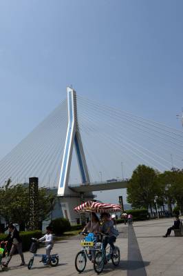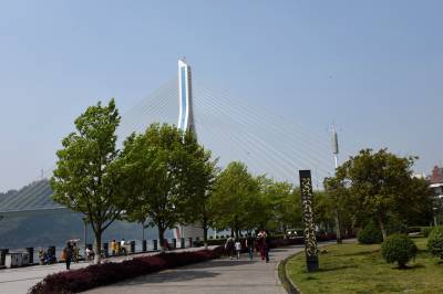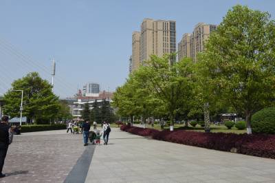 公园各部分路面铺装,选用上海舒布洛克青色长方砖,宜昌三峡豹斑、芝麻黑、灰色小条石花岗岩板,用8种图案铺装而成,彩色条石勾勒出道路曲线。铺装工程采用浅灰色为主色调,摒弃了传统的红、绿、白大方块花岗石板铺装方式,特色鲜明。