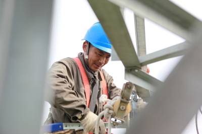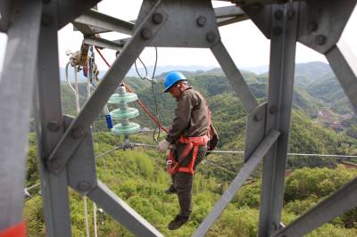 4月7日,湖北省电力公司工作人员正在宜都市35千伏丁何线9#塔上更换遭雷击损坏的瓷瓶。自进入雷雨季节以来,湖北省电力公司安排人员进行线路设备特巡,及时发现并消除雷击隐患,保障全省人民安全可靠用电。屈琪骥