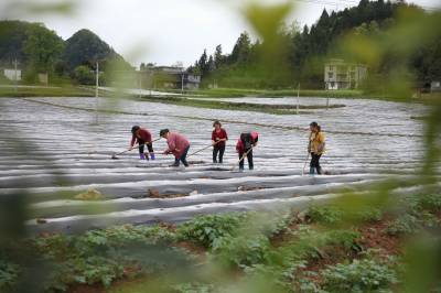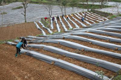 4月6日,咸丰县朝阳寺镇鸡鸣坝村村民在烤烟地里抢墒覆膜。 入春以来,田野乡村一片农忙景象,树的新绿与膜的线条构成一幅精美的春耕图画。