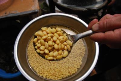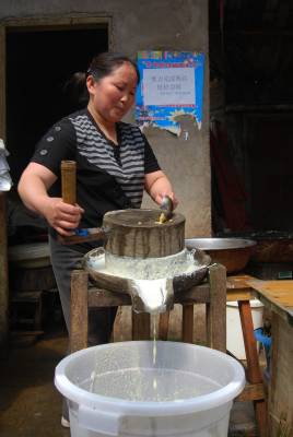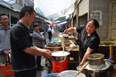 6月14日一大早,宣恩县土家族妇女刘仁香就到县城营通市场用小石磨将已泡胀的黄豆原料(图一)推磨成和渣(图二),卖给县城居民(图三)过端午节吃。刘仁香介绍说,她在县城用小石磨推磨和渣已10年,每天要卖40斤黄豆的和渣,一年要卖1.5万斤黄豆的和渣,满足县城6万多户次居民吃和渣的需求。据了解,用小石磨推磨和渣是土家族的传统家庭生活习俗。随着改革开放的深入,用小石磨推磨和渣这一土家族的传统家庭生活习俗,业已走出家庭,进入市场,现磨现卖,环保卫生,为更多的居民喜爱和享受,从而具有了”放大效应”。(签约摄影师汪盛华)