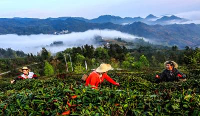 2016年4月10日清晨,游客和茶农在竹溪县龙王垭生态茶园一边采摘春茶,一边享受涌动壮观唯美流云景观。