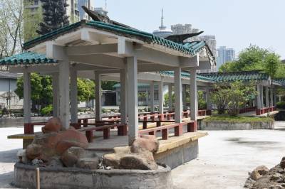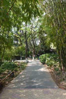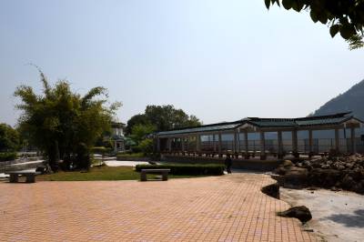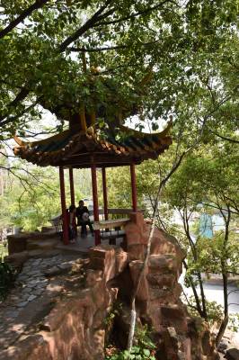 南榭园占地1.35万平方米,始建于1984年,是滨江公园的园中园。南榭园的门是仿古的琉璃门,一进大门就能看见旅游节的吉祥物“鲟鲟”。鲟鲟的周围盛开着菊花、一串红、鸡冠花,两旁放着许多盆景和根雕,有怪松,有奇峰,有文母,有黄杨,有峡江人家的金橘,有春满三峡绿枝……景色宜人,姿态各异。走在园中,步移景异,情趣盎然。