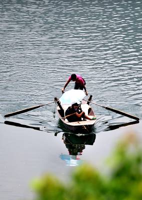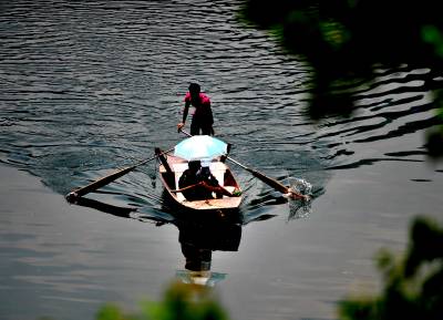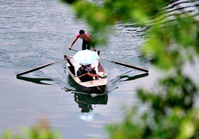 14日,宣恩县双龙湖水库上,人们划着三板船在湖上悠闲地游玩。随着山区水电产业的兴起,深山中的”高峡平湖”风光无限,其平静的湖面、两岸秀美的山林,使划着山板的人们可以远离城市的喧嚣,去感受大自然的宁静与美好。(视界网签约摄影师:宋文摄)