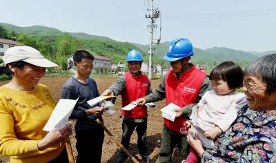 2016年4月13日,供电所共产党员服务队正在为田间地头劳作的农民发放安全用电宣传资料。当日,国网湖北省南漳县供电公司肖堰供电所共产党员服务队深入到肖堰镇班竹坪村开展安全用电宣传活动。大力宣传安全用电知识,指导广大群众安全用电。至此,拉开全县用电安全进万家的序幕。开春以来,该公司共印制安全生产用电资料5000余份,将于一周内全部发送到全县11个镇、区群众手中。