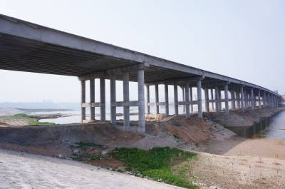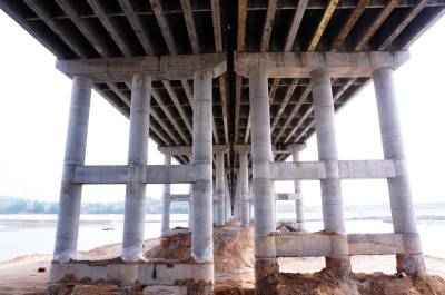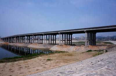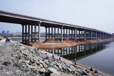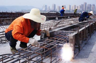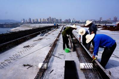 4月14日,建桥工人正在湖北省十堰市郧阳区汉江北岸施工棒槌河大桥桥面,标志着槌河大桥完成东西合拢架设。棒槌河大桥是郧阳区城区至"郧十"高速公路互通的联接线,是全长6公里的郧府大道中的一座在建大桥。全长560米,宽35米,双向四车道,设计时速60公里,总投资为9700万元。棒槌河大桥的合拢标志着郧府大道完成所有桥梁建设。 视界网周家山 摄