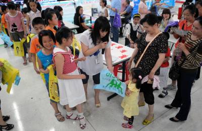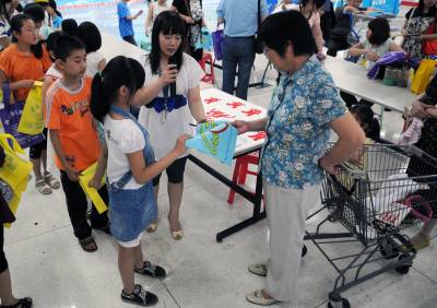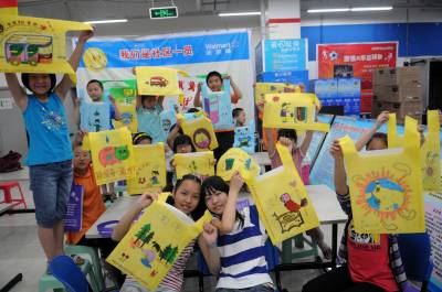 6月14日,沃尔玛襄樊店邀请一家美术学校的小学生,现场自制50多个环保袋,并赠送给正在购物的顾客。谢勇摄