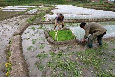 图一: 4月24日,房县城关镇晓阳村农民在管护秧苗