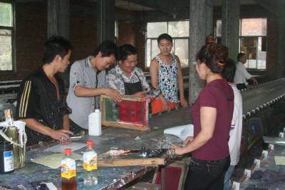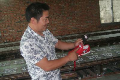 6月15日,在浙江台州创业从事鞋面印花的宣恩县晓关侗族乡倒洞村34岁的侗族汉子乐春华,指导员工鞋面印花(图一),将加工的鞋面印花成品(图二)销售给浙江境内的几家鞋厂(图三)。乐春华于1999年开始外出在浙江台州打工并学得鞋面印花技术;2005年投资50万元,在浙江台州创业开始从事鞋面印花,经过购置鞋子半成品——选择花样图案——用电脑制作花样图案模板——配置颜色——将花样图案印到鞋面上——做成鞋面印花成品——销售成品等几个环节,日均鞋面印花5000双,年产值80万元;乐春华用60万元创业收入在老家倒洞村建起晓关侗族乡第一栋农民别墅。(签约摄影师汪盛华陈再国)(拍摄地:浙江台州)